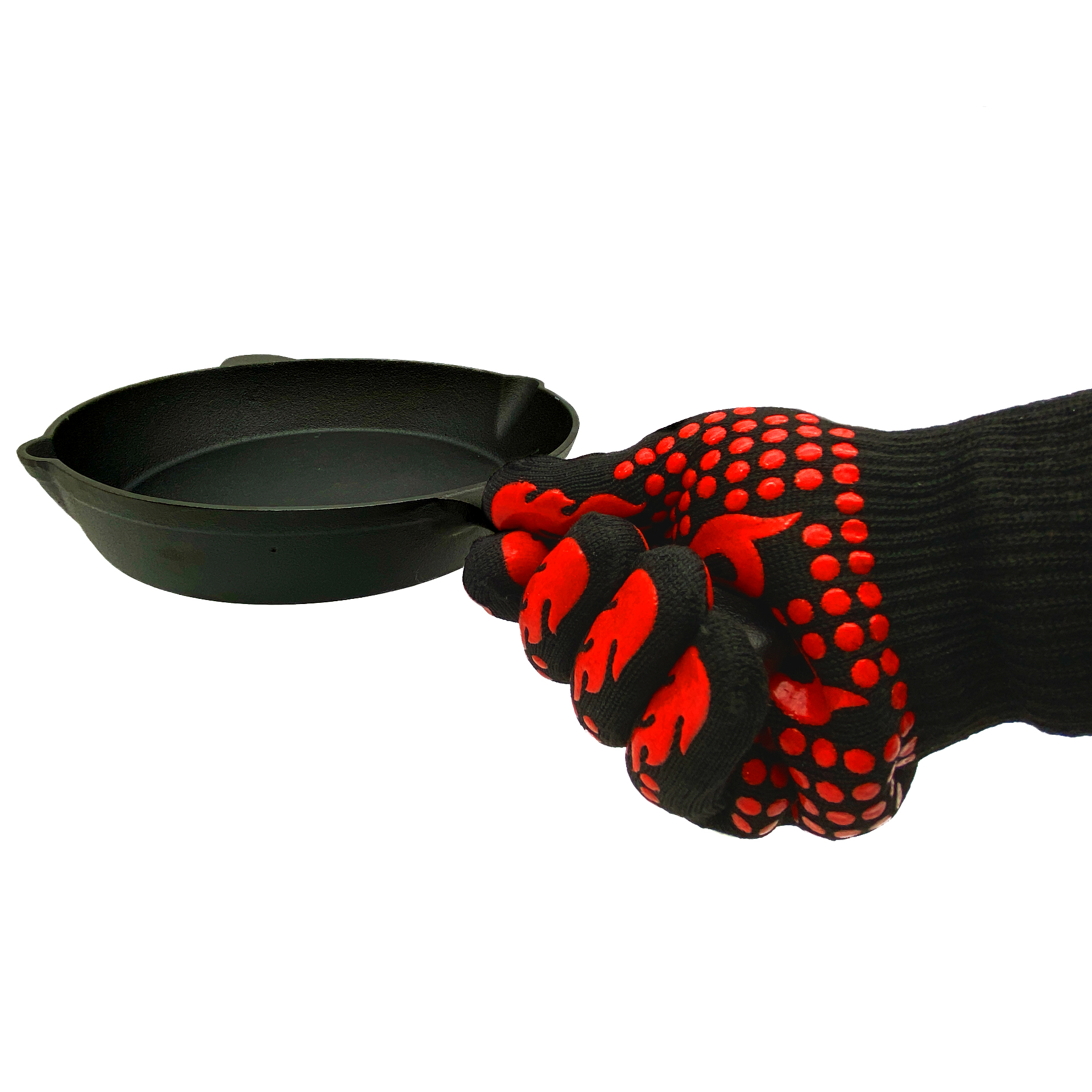 Dieses Grillhandschuh-Paar schützt Hände und Unterarme zuverlässig bei hohen Temperaturen – ideal am Holzkohlegrill, Gasgrill, Pizzaofen, Dutch Oven oder beim Gusseisenpfannen-Handling. Das hitzebeständige Spezialgewebe ist für Temperaturen bis zu 500 °C ausgelegt und die griffige Oberfläche sorgt für einen sicheren Halt, selbst bei fettigen oder glatten Oberflächen. Durch die verlängerte Stulpe bleibt auch der Unterarm besser abgeschirmt.