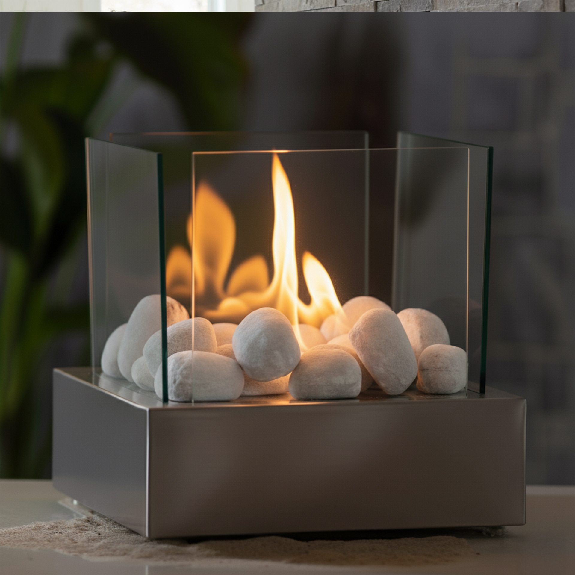 Für Ethanol- und Gelkamine, Tischfeuer und dekorative Feuerschalen – immer so platzieren, dass die Flamme frei arbeiten kann.
