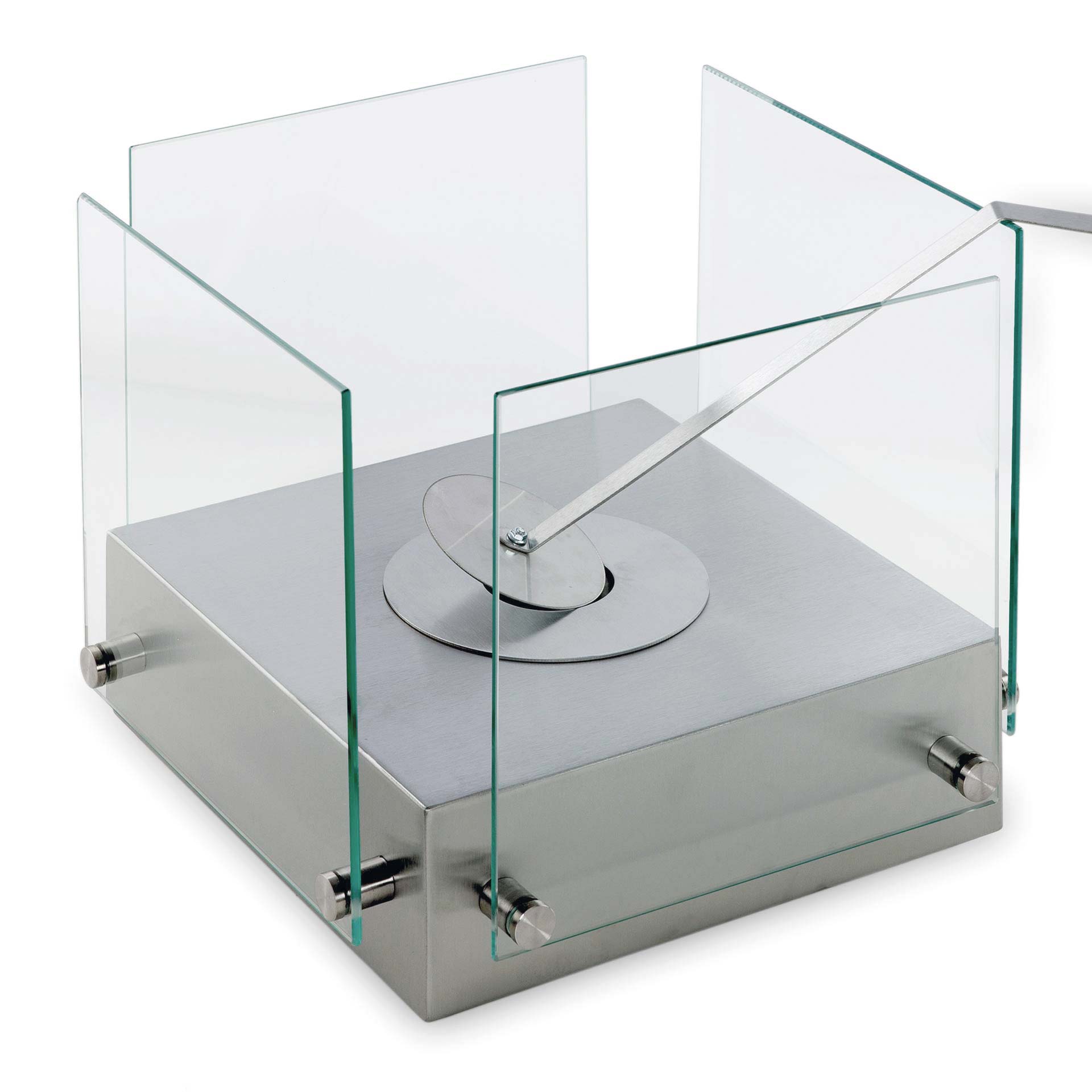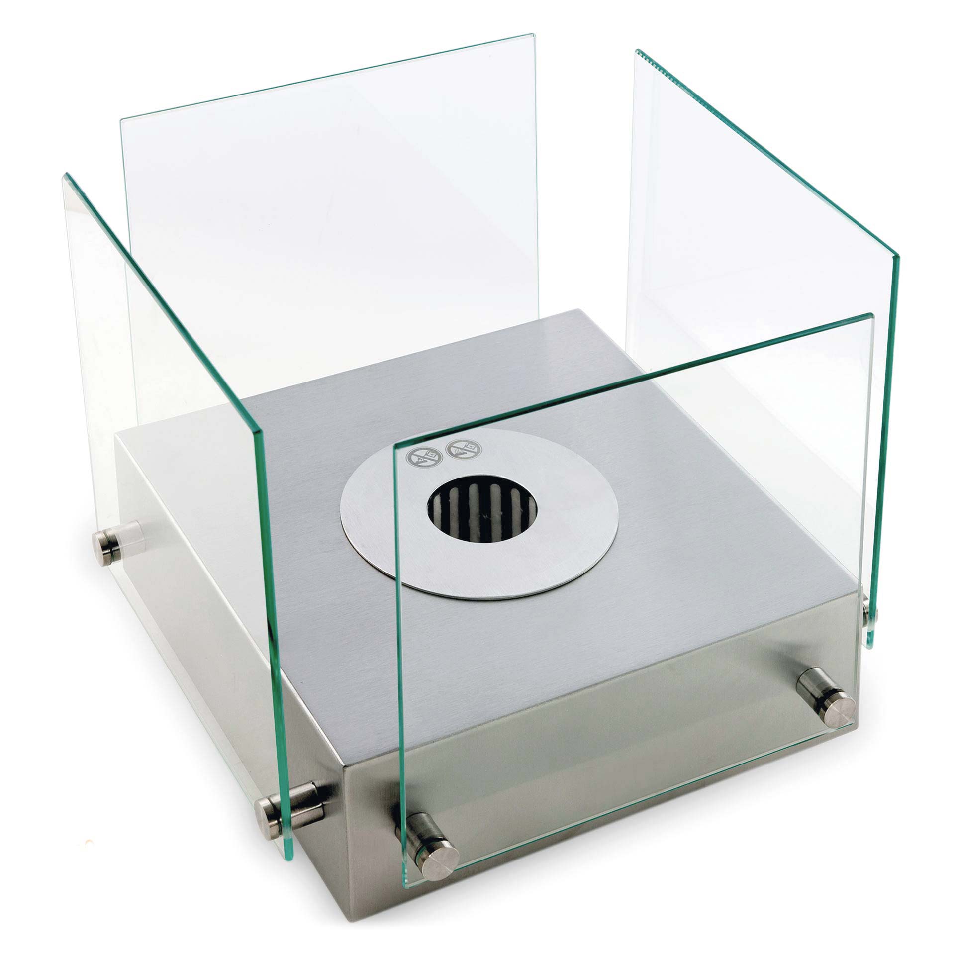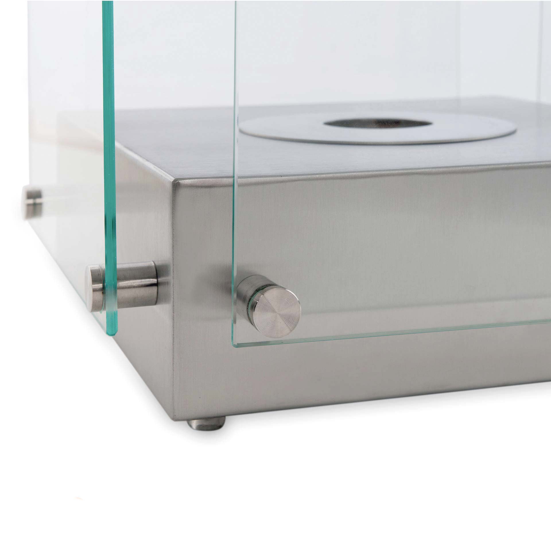 Das Gehäuse besteht aus robustem Edelstahl mit edler Oberfläche. Eine umlaufende Sicherheitsglasscheibe schützt vor Wind und ungewolltem Kontakt mit der Flamme, ohne die Sicht zu beeinträchtigen. Der integrierte Brenner mit Keramikwatte wurde präzise gefertigt, um ein gleichmäßiges, ruhiges Flammenbild bei Nutzung von Bio-Ethanol zu gewährleisten.
