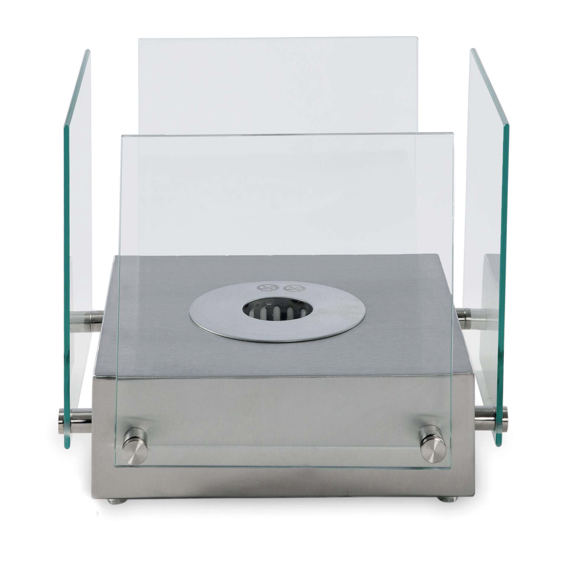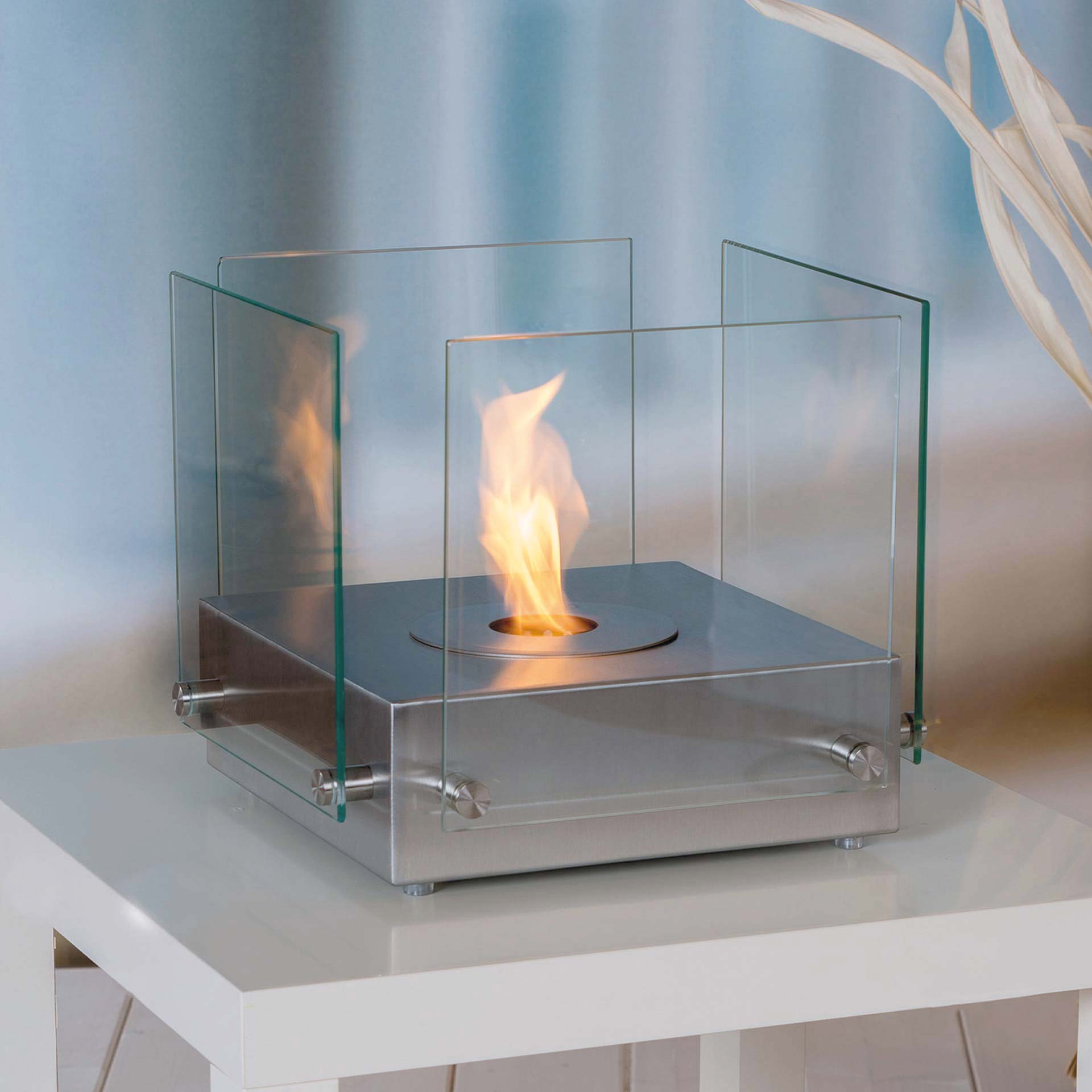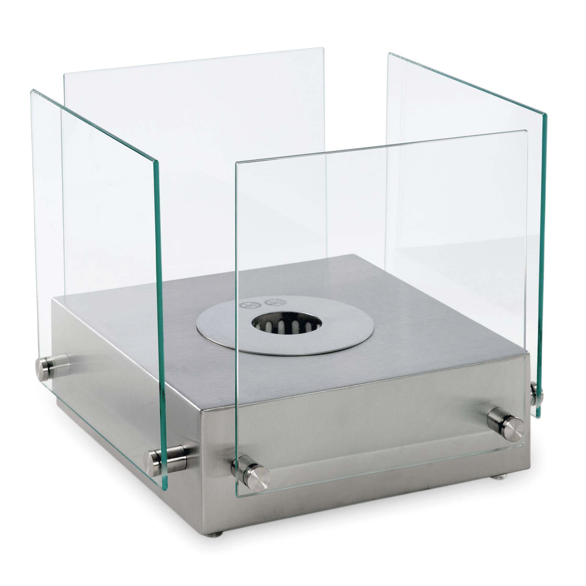 Das Gehäuse besteht aus robustem Edelstahl mit edler Oberfläche. Eine umlaufende Sicherheitsglasscheibe schützt vor Wind und ungewolltem Kontakt mit der Flamme, ohne die Sicht zu beeinträchtigen. Der integrierte Brenner mit Keramikwatte wurde präzise gefertigt, um ein gleichmäßiges, ruhiges Flammenbild bei Nutzung von Bio-Ethanol zu gewährleisten.