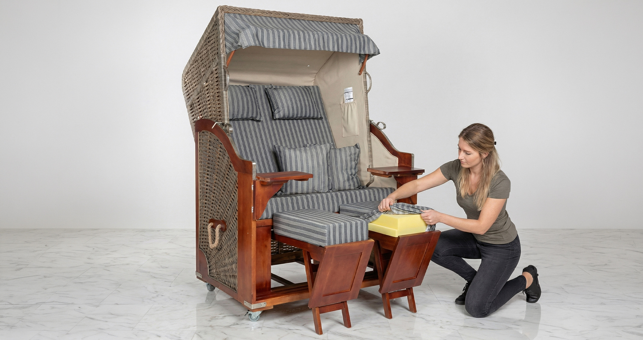 Besonders gefragt sind 1-Sitzer Strandkörbe für Balkone oder kleinere Terrassen, 2-Sitzer Strandkörbe als vielseitiger Klassiker und 2,5-Sitzer Strandkörbe für besonders entspanntes Sitzen und Liegen. Wer noch mehr Wert auf Komfort, Verarbeitung und Ausstattung legt, findet in der Premium Line hochwertige Modelle für gehobene Ansprüche.