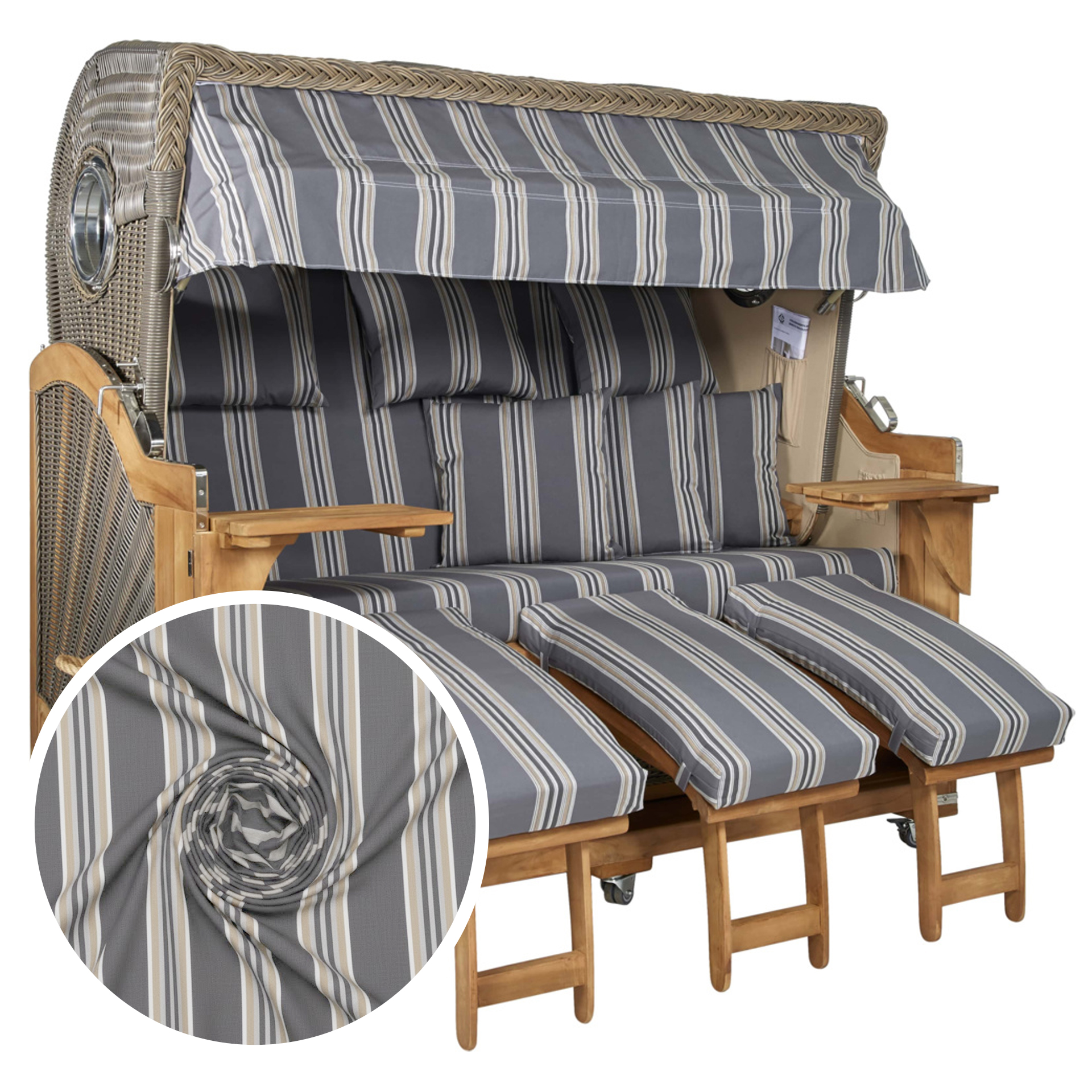 Erleben Sie die außergewöhnliche Kombination aus Luxus und Entspannung mit unserem exquisiten 3-Sitzer Strandkorb Pazifik in grau gestreift. Dieses Meisterwerk vereint zeitlose Eleganz mit unübertroffenem Komfort und ermöglicht es Ihnen, die Küstenatmosphäre in vollen Zügen zu genießen. Durch seine großzügigen Abmessungen, hochwertigen Materialien und durchdachten Details bietet Ihnen dieser Strandkorb ein ganz neues Maß an Entspannung. Egal, ob Sie sich auf Ihrem Balkon, auf Ihrer Terrasse oder in Ihrem Garten erholen möchten – mit diesem 3-Sitzer Strandkorb hüllen Sie sich in ein Gefühl von Luxus und Gemütlichkeit, das Sie nie mehr missen möchten. Entdecken Sie eine Welt der vollkommenen Erholung und lassen Sie sich von diesem Strandkorb in ein unvergleichliches Entspannungserlebnis entführen.