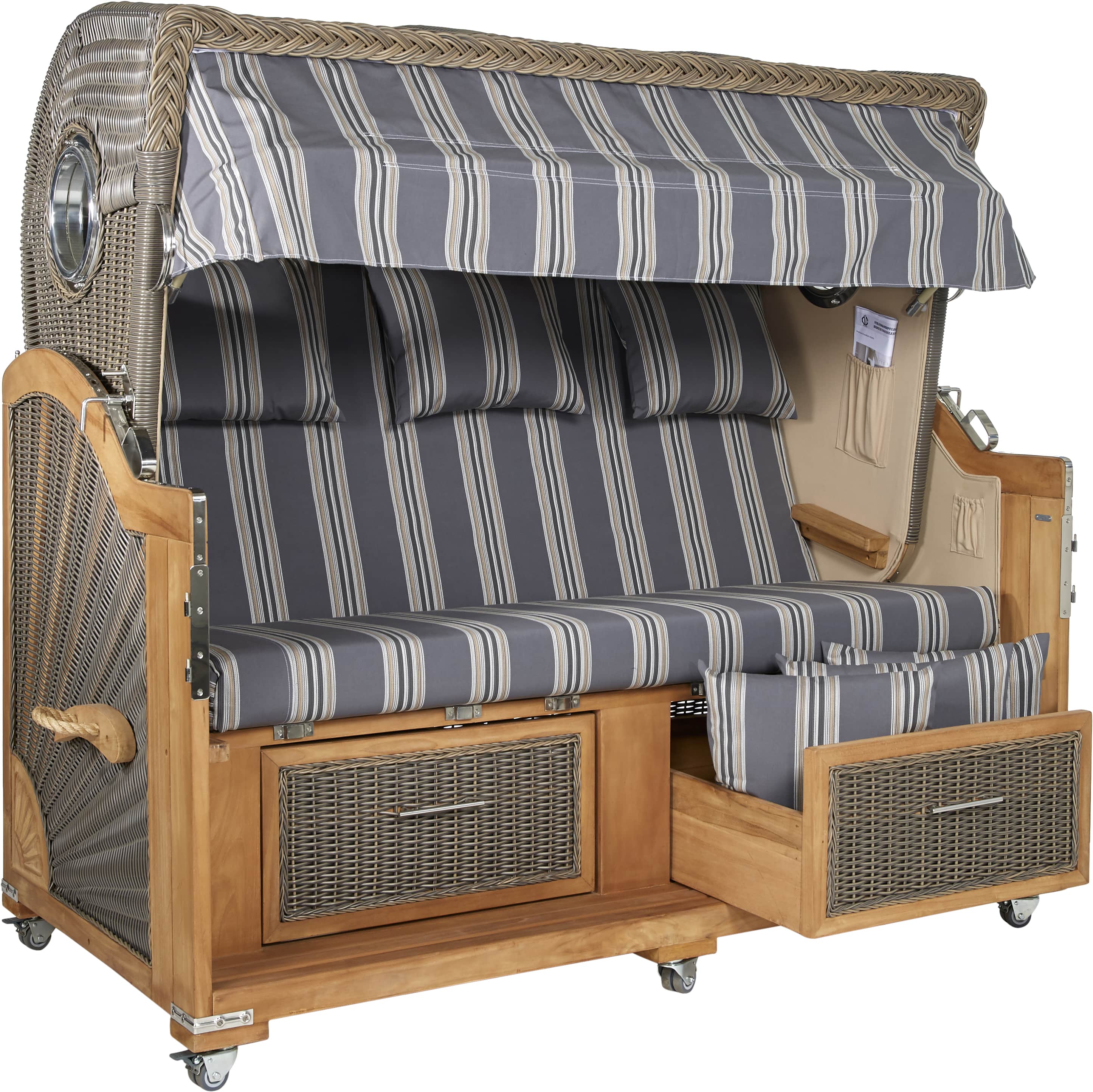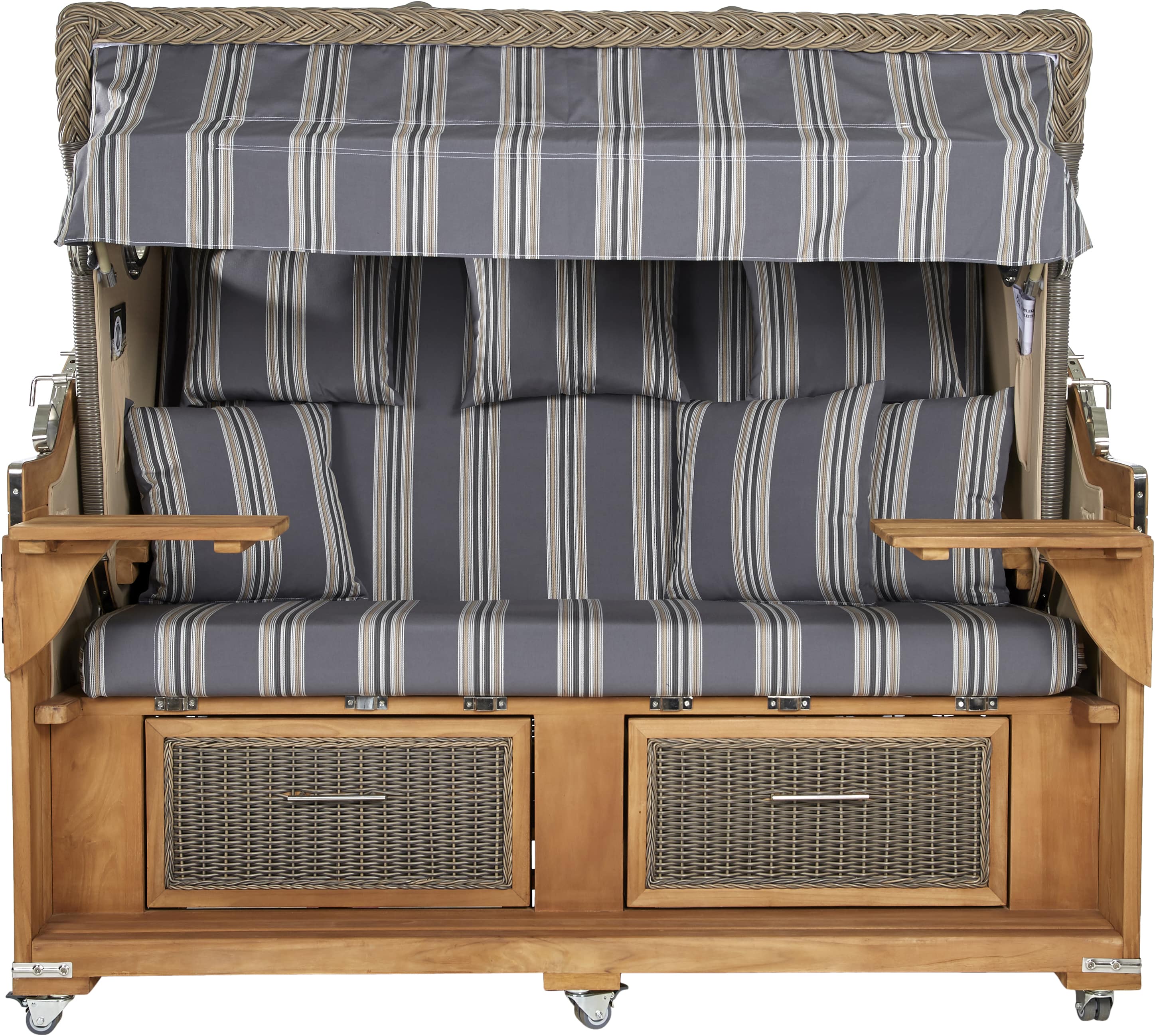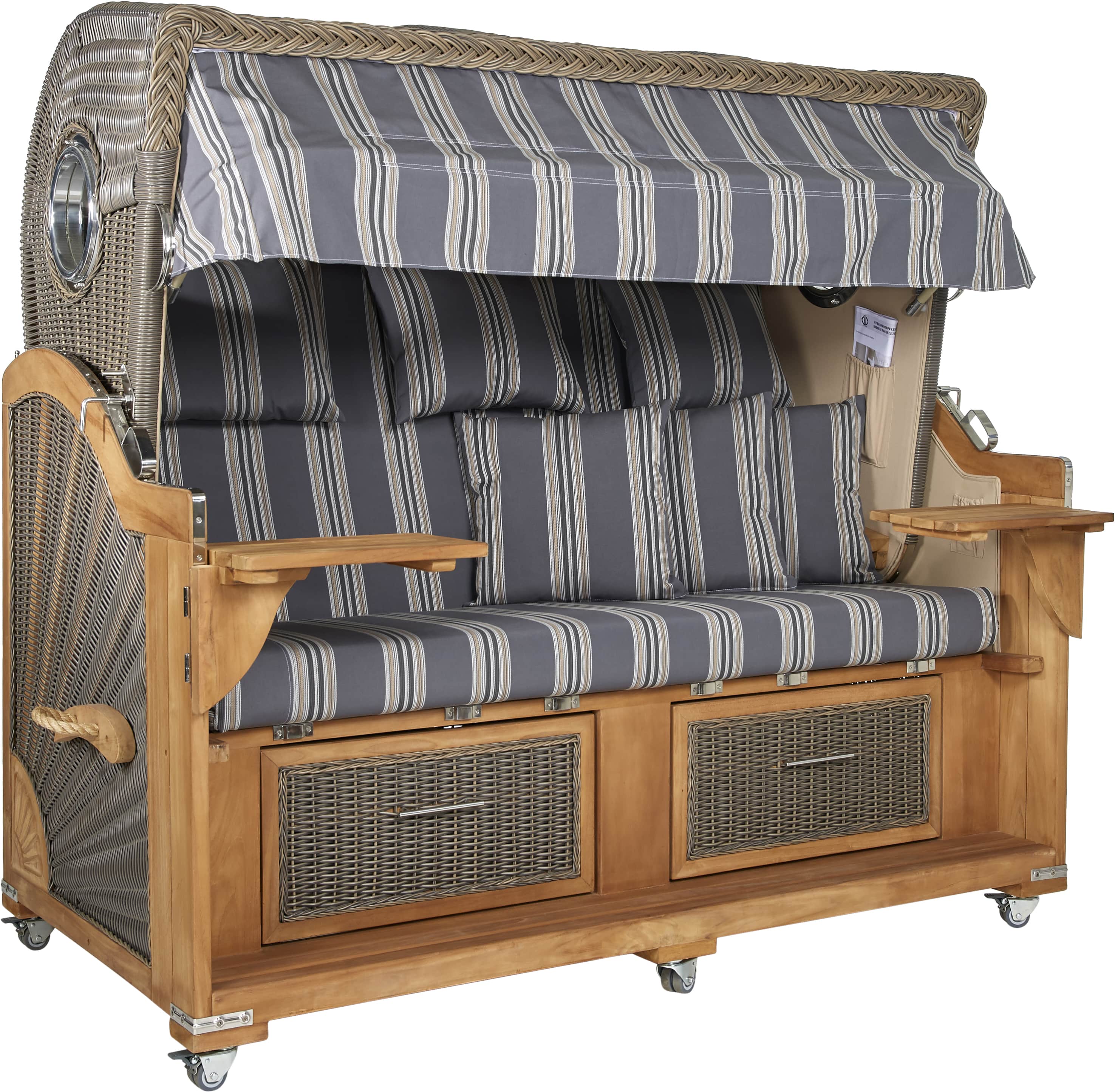 Erleben Sie die außergewöhnliche Kombination aus Luxus und Entspannung mit unserem exquisiten 3-Sitzer Strandkorb Pazifik in grau gestreift. Dieses Meisterwerk vereint zeitlose Eleganz mit unübertroffenem Komfort und ermöglicht es Ihnen, die Küstenatmosphäre in vollen Zügen zu genießen. Durch seine großzügigen Abmessungen, hochwertigen Materialien und durchdachten Details bietet Ihnen dieser Strandkorb ein ganz neues Maß an Entspannung. Egal, ob Sie sich auf Ihrem Balkon, auf Ihrer Terrasse oder in Ihrem Garten erholen möchten – mit diesem 3-Sitzer Strandkorb hüllen Sie sich in ein Gefühl von Luxus und Gemütlichkeit, das Sie nie mehr missen möchten. Entdecken Sie eine Welt der vollkommenen Erholung und lassen Sie sich von diesem Strandkorb in ein unvergleichliches Entspannungserlebnis entführen.