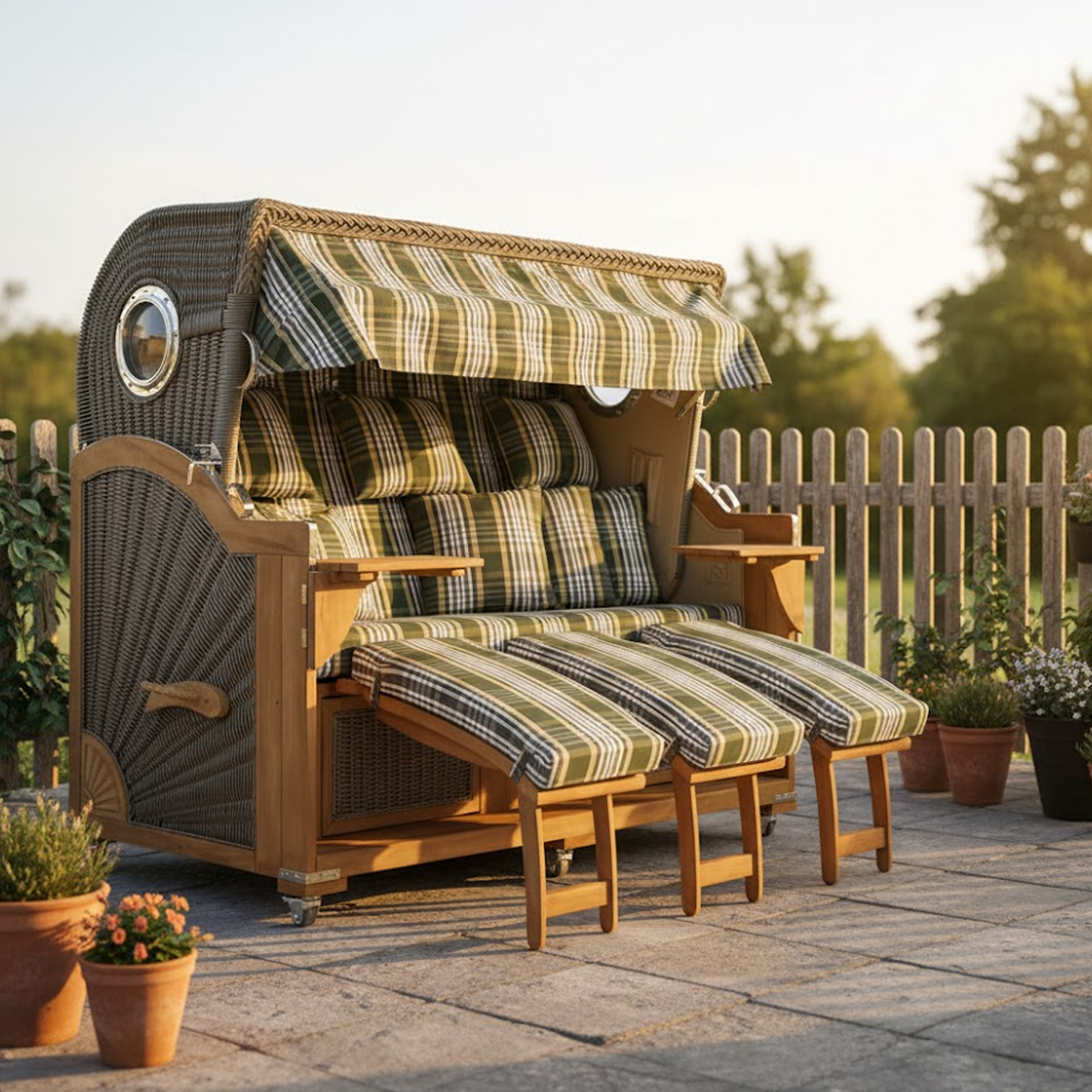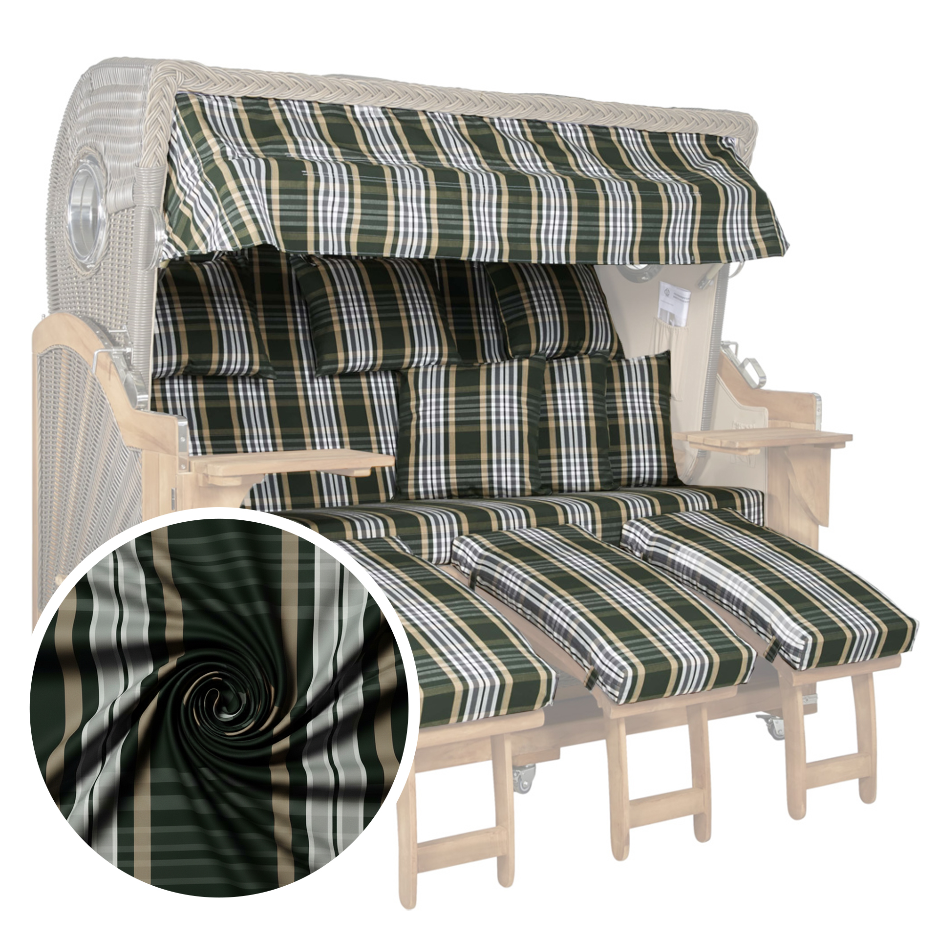 Erleben Sie die außergewöhnliche Kombination aus Luxus und Entspannung mit dem Webavita Pazifik in grün kariert. Dieses Meisterwerk vereint zeitlose Eleganz mit unübertroffenem Komfort und ermöglicht es Ihnen, die Küstenatmosphäre in vollen Zügen zu genießen. Durch seine großzügigen Abmessungen, hochwertigen Materialien und durchdachten Details bietet Ihnen dieser Strandkorb ein ganz neues Maß an Entspannung. Egal ob auf Ihrem Balkon, auf Ihrer Terrasse oder in Ihrem Garten erholen möchten – mit diesem Luxus 3-Sitzer Strandkorb hüllen Sie sich in ein Gefühl von Luxus und Gemütlichkeit, das Sie nie mehr missen möchten.