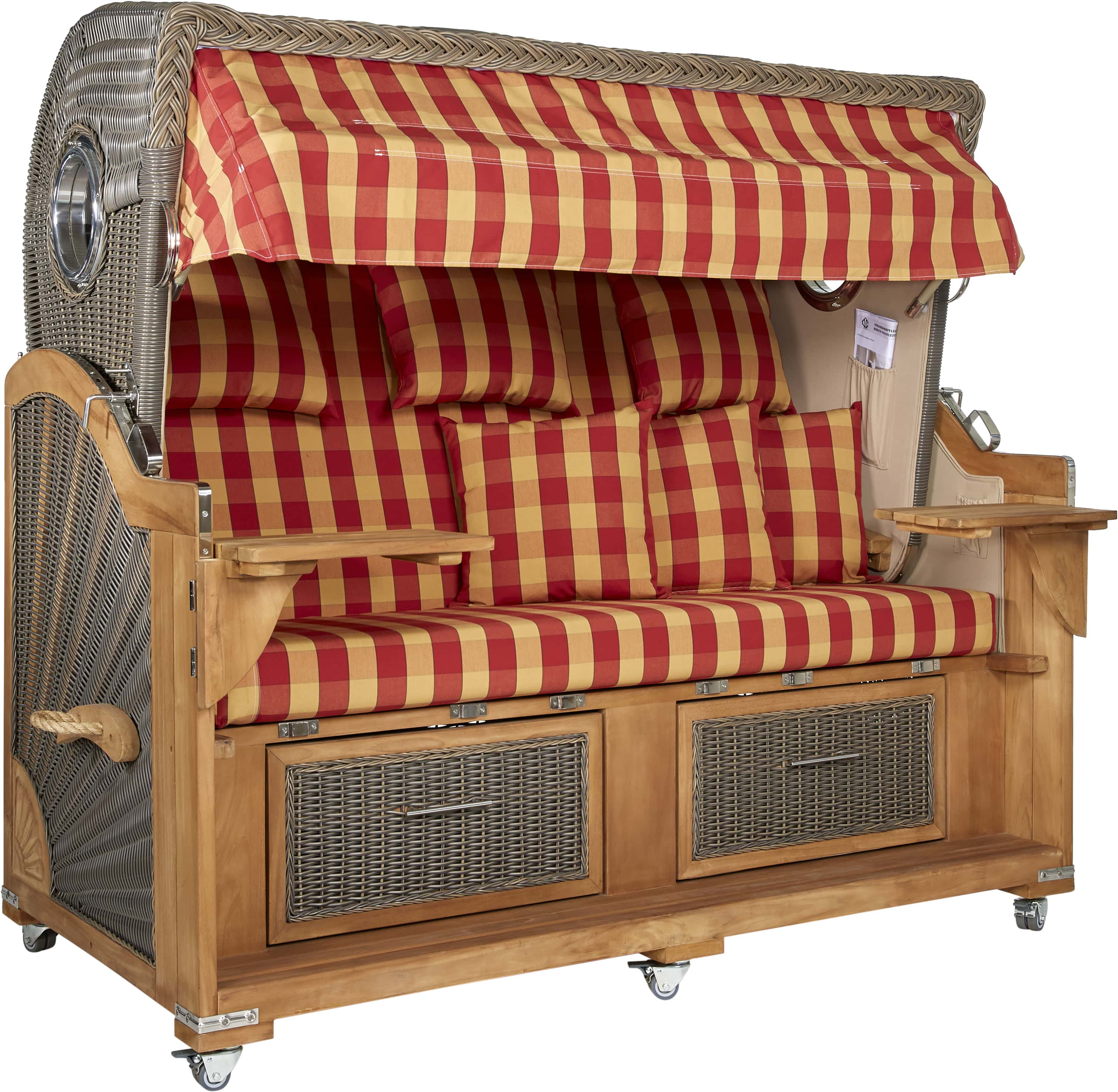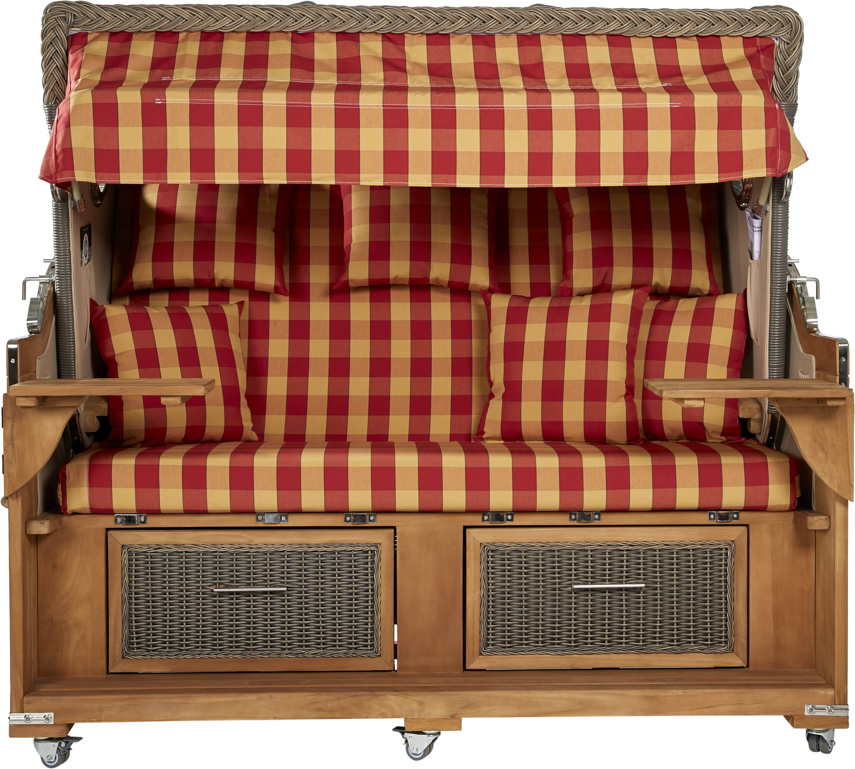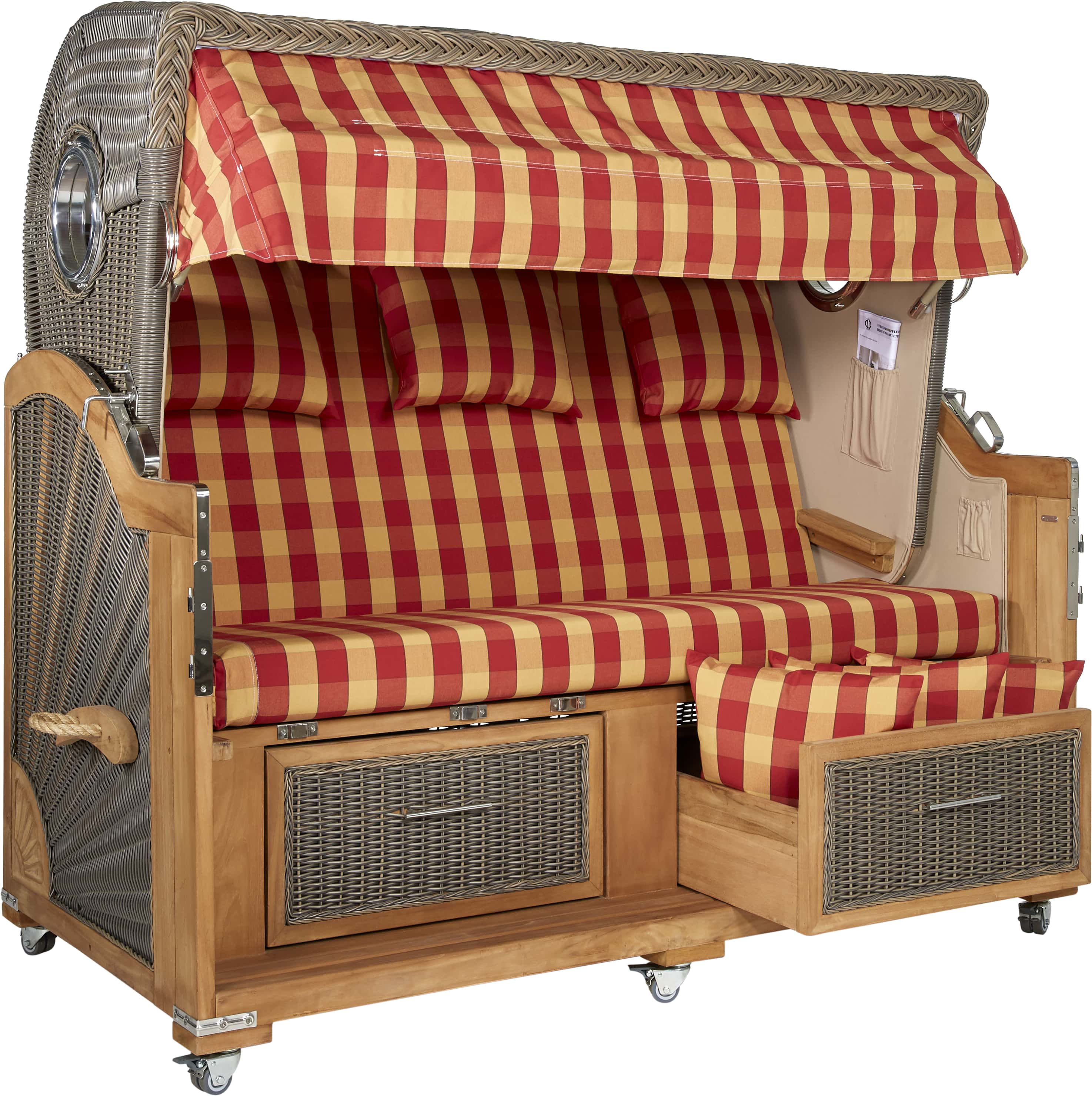 Erleben Sie die außergewöhnliche Kombination aus Luxus und Entspannung mit dem Webavita Pazifik rot kariert. Dieses Meisterwerk vereint zeitlose Eleganz mit unübertroffenem Komfort und ermöglicht es Ihnen, die Küstenatmosphäre in vollen Zügen zu genießen. Durch seine großzügigen Abmessungen, hochwertigen Materialien und durchdachten Details bietet Ihnen dieser Strandkorb ein ganz neues Maß an Entspannung. Egal ob auf Ihrem Balkon, auf Ihrer Terrasse oder in Ihrem Garten erholen möchten – mit diesem Luxus 3-Sitzer Strandkorb hüllen Sie sich in ein Gefühl von Luxus und Gemütlichkeit, das Sie nie mehr missen möchten.