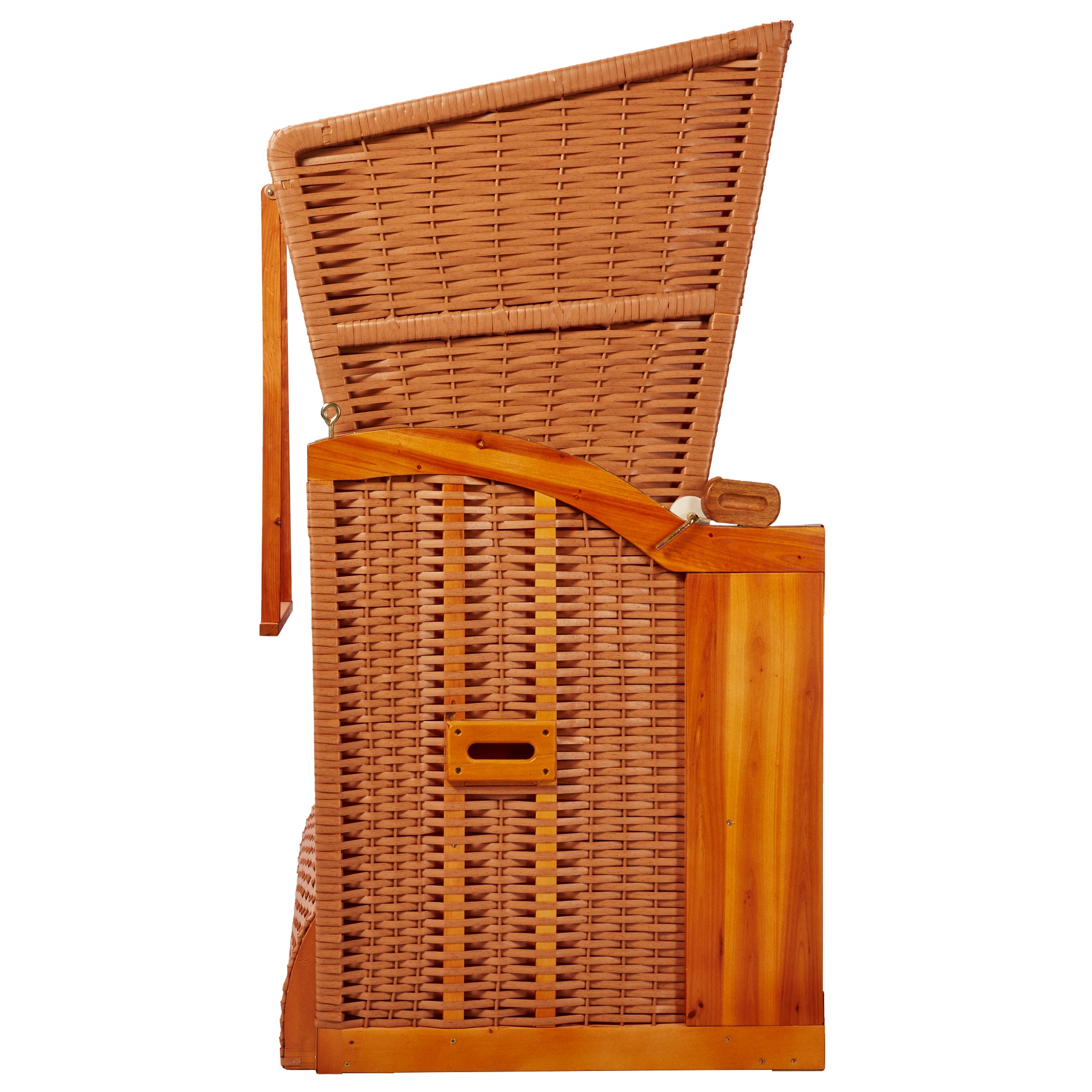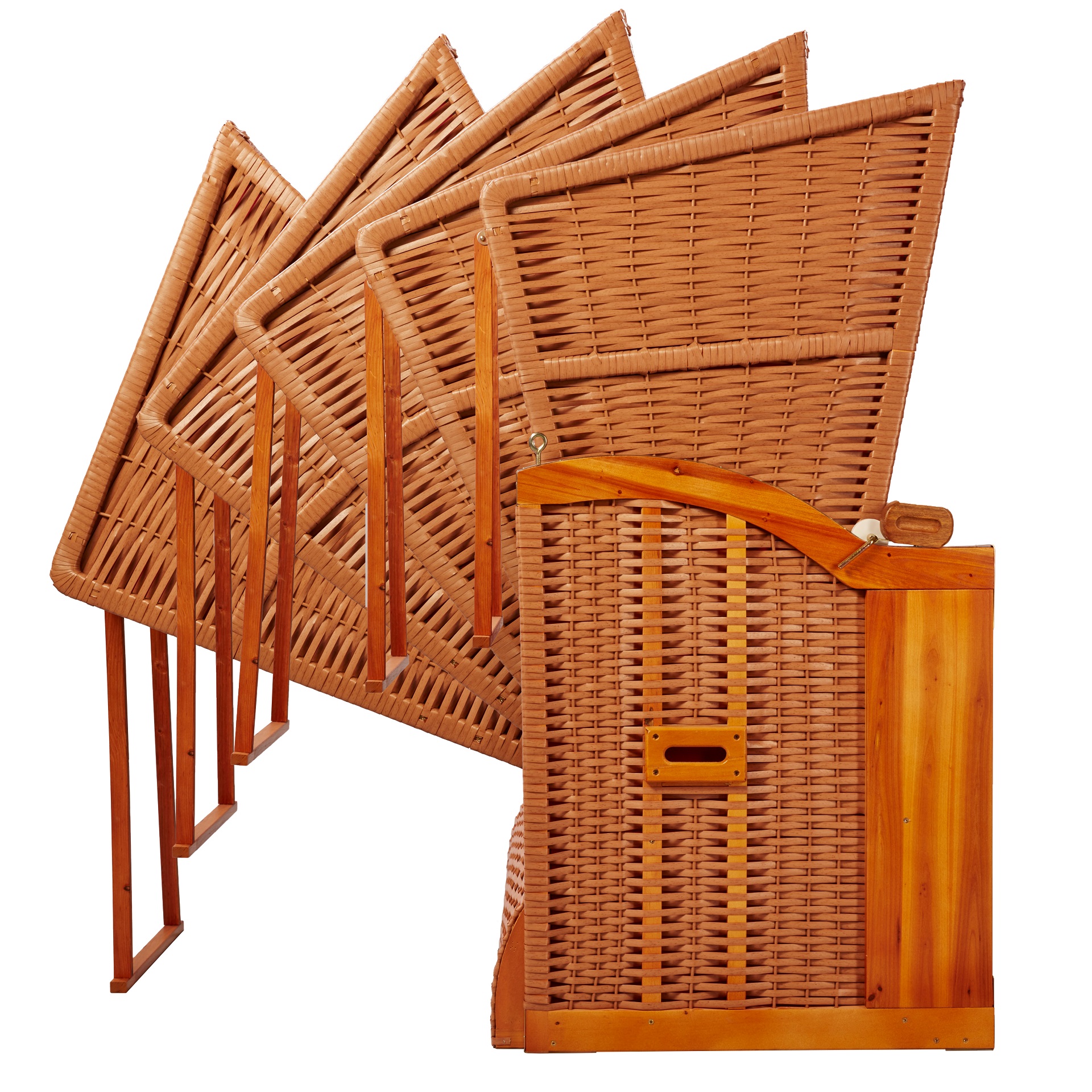 Viele Strandkörbe bieten Staufächer unter der Sitzfläche oder im Fussbereich (modellabhängig) – praktisch für Decken, Kissen und Zubehör.