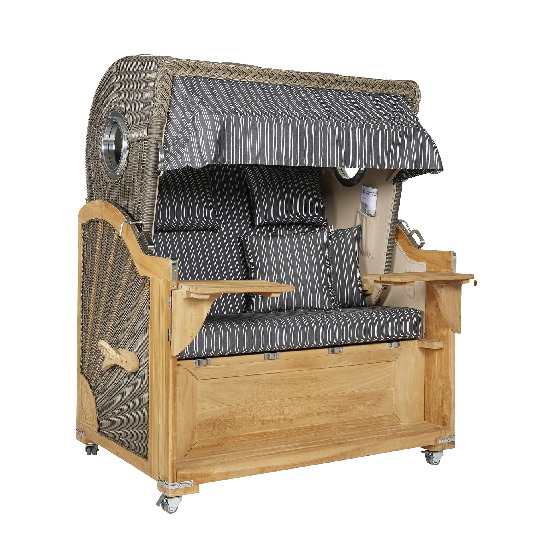 Komplett montiert und mit beiden Wurf- und Nackenkissen sowie den einhängbaren und höhenverstellbaren Fußstützen mit extra dicken Fußkissen bietet er höchsten Komfort. Praktische Zeitungstaschen und extra Smartphonetaschen auf beiden Seiten bieten zusätzlichen Stauraum. Die beiden schwenkbaren Tische bieten eine stabile Ablagefläche für Snacks und Getränke. Ein großes Staufach unter der Sitzfläche ermöglicht es, die Fußstützen und eine Schutzhülle bei Nichtgebrauch bequem zu verstauen. Der Oberkorb kann bis zu einem Winkel von 80° geneigt werden, um eine gemütliche Liegefläche zu schaffen. Ausgestattet mit Teakholz und handgefertigtem, wetterfestem Polyrattan-Geflecht garantiert der Strandkorb Audrey Langlebigkeit und ansprechende Optik.