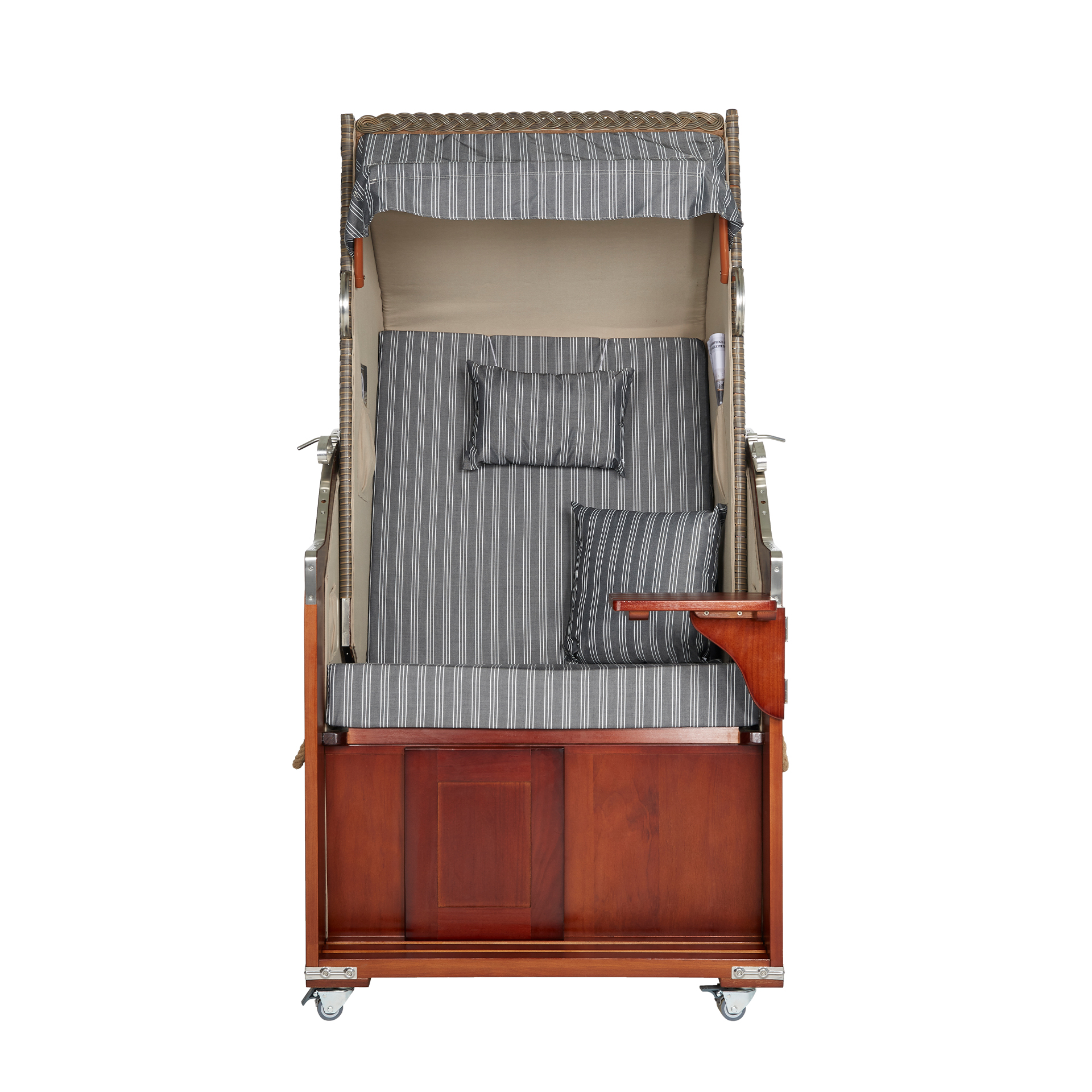 Der Ava Deluxe Strandkorb überzeugt durch seine harmonische Kombination aus natürlichem Holz und modernen Grautönen. Trotz seiner kompakten Größe bietet er denselben Komfort wie größere Modelle – perfekt für ruhige Lesestunden oder kleine Pausen im Alltag. Die ergonomische Form, die verstellbare Lehne und die weichen Polster schaffen ein gemütliches Sitzgefühl, das zum Verweilen einlädt.
