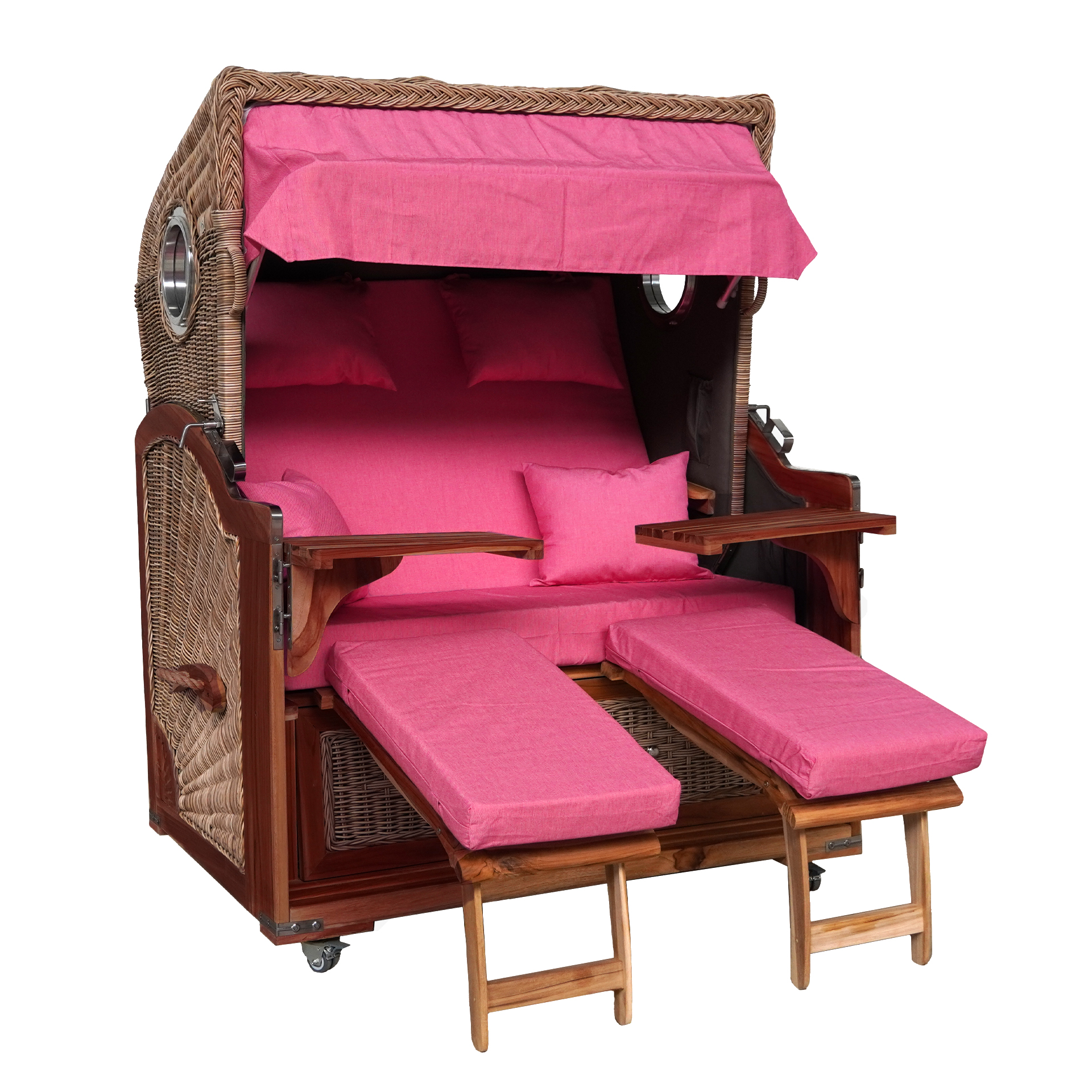 Unser Webavita Strandkorb Bali Mahagoni in Hispano rosa ist der perfekte Hingucker für entspannte Stunden auf dem Balkon, der Terrasse oder im Garten. Dieses Modell der Premiumklasse ist handgefertigt und mit den beiden Bullaugen ein echter Blickfang.