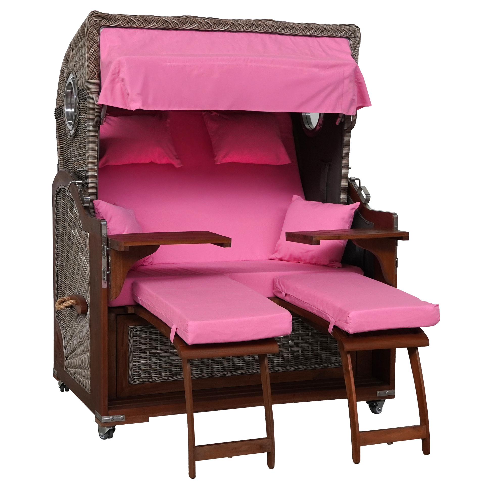 Unser Webavita Strandkorb Bali Mahagoni in rosa ist die perfekte Sitzgelegenheit für friedvolle Stunden auf dem Balkon, der Terrasse oder im Garten. Das handgefertigte Modell der Premiumklasse ist mit den beiden Bullaugen ein echte Attraktion in Ihrem Zuhause.