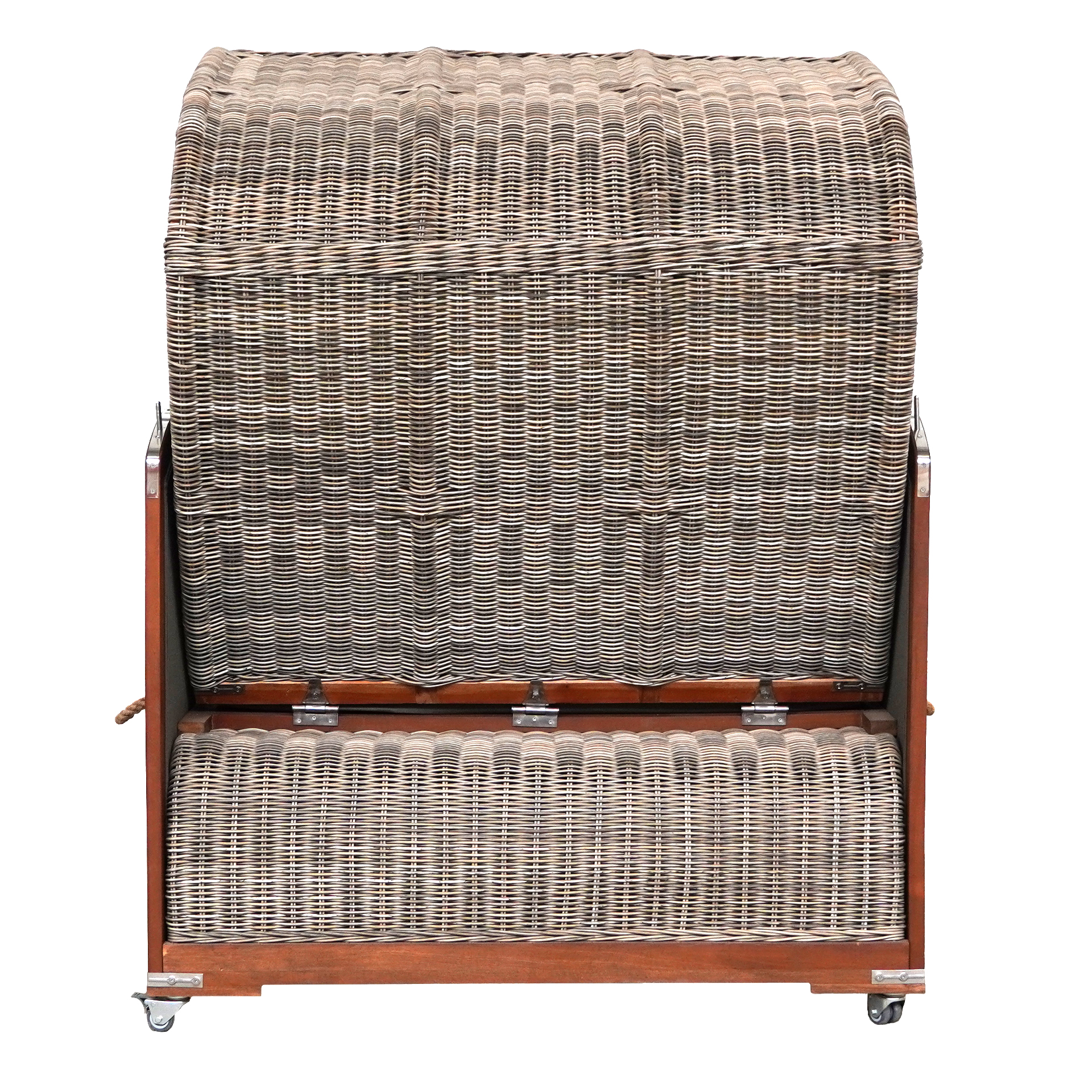 Der Strandkorb Bali wird komplett montiert geliefert und verfügt über ein Doppelrollen 4er-Set. Für höchsten Komfort sorgen die beiden Wurf- und Nackenkissen, sowie die beiden höhenverstellbaren Fußstützen mit dicken Fußkissen. Unter der Sitzfläche befindet sich eine große Schublade, in der Sie die Fußstützen und die Schutzhülle bei Nichtgebrauch bequem verstauen können. Der Oberkorb kann bis zu einem Winkel von ca. 75° geneigt werden, wodurch eine gemütliche Liegefläche entsteht. Dank des wetterfesten Polyrattan-Geflechts ist dieser Strandkorb pflegeleicht und langlebig. Die Holzelemente bestehen aus hochwertigem Mahagoniholz.