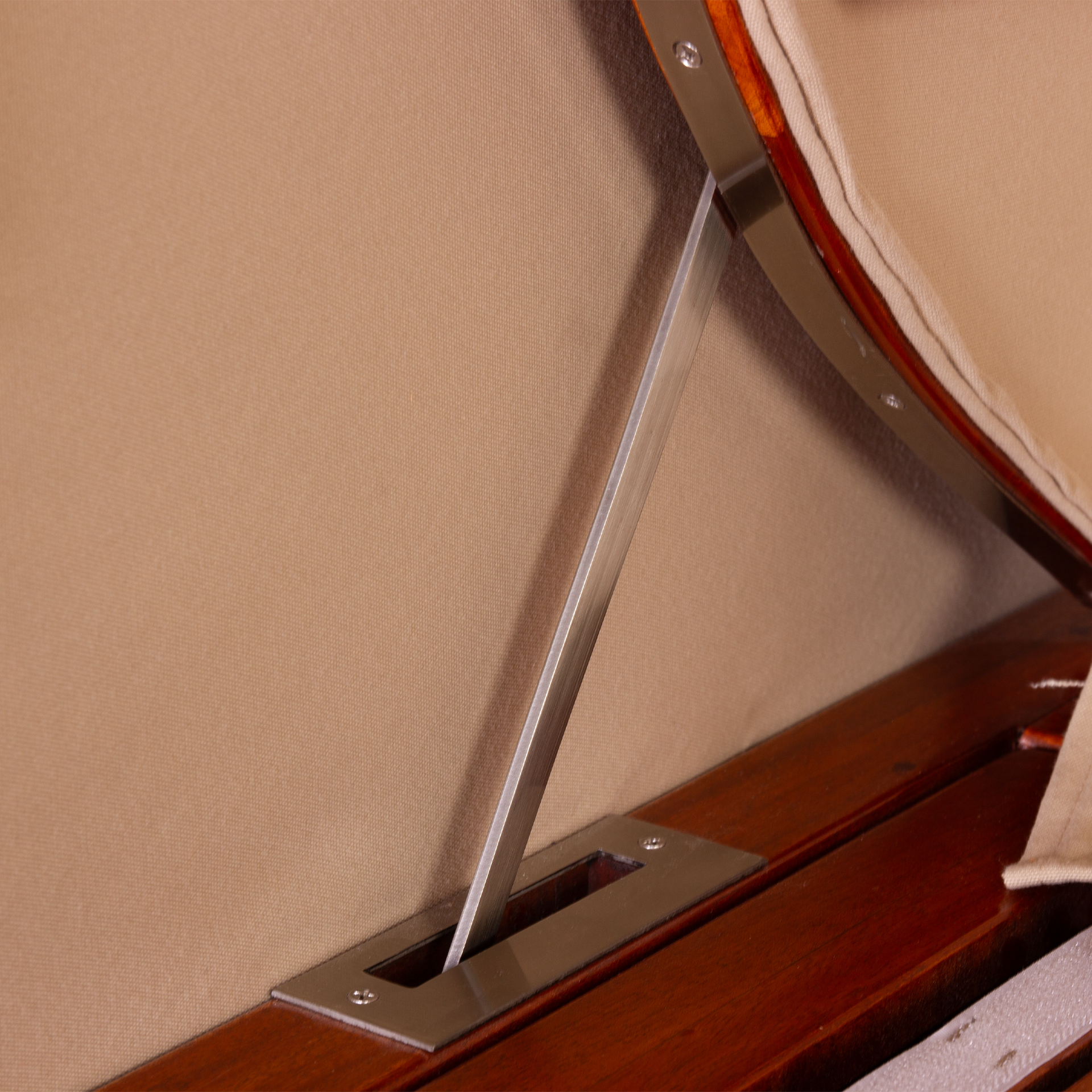 Damit das Holz seinen Witterungsschutz behält, behandeln Sie es mindestens einmal pro Jahr mit einem Holzschutz. Zum Reinigen des Stoffes verwenden Sie eine warme Seifenlauge. Vermeiden Sie Hochdruckreiniger.