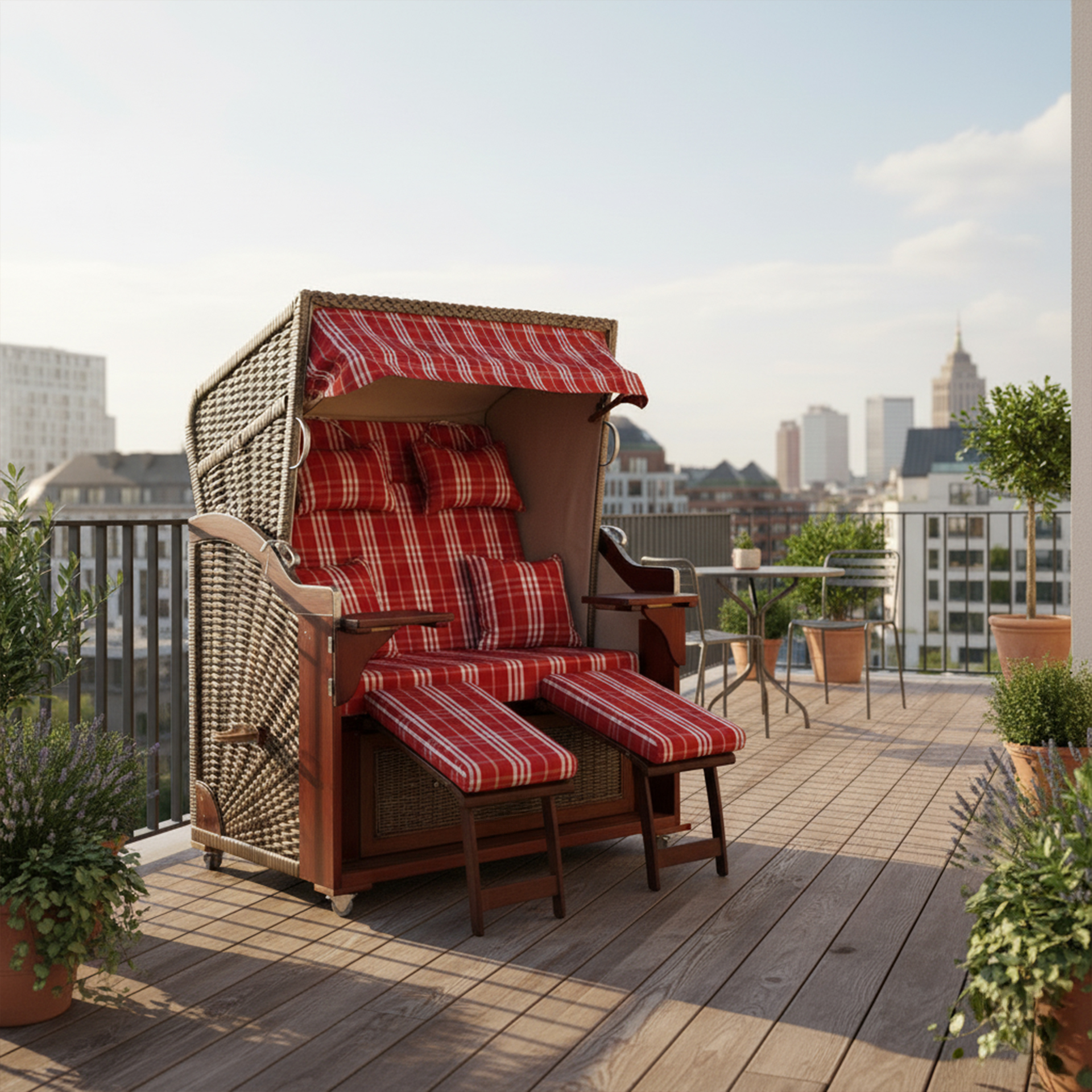 Sofort neuer Gesamteindruck: Mit dem Rot Weiß karierten Muster bekommt dein Strandkorb wieder den typischen Urlaubs-Charakter und wirkt gepflegt und einladend – ideal auf Terrasse, Balkon, am Pool oder in der Ferienimmobilie. Gleichzeitig bleibt der Sitzkomfort erhalten – perfekt für lange Lesemomente, Kaffeepause oder Sundowner. Besonders harmonisch wirkt der Bezug auf den hauseigenen Modellen Romy, Audrey und Pazifik.