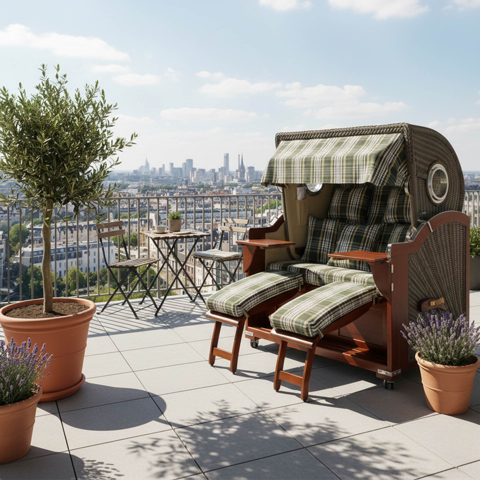 Die Materialien sind outdoor-tauglich, sollten aber nicht dauerhaft durchnässen. Bei längerem Regen Polster trocken lagern verlängert die Lebensdauer deutlich – gerade bei häufiger Nutzung auf Terrasse oder Balkon.