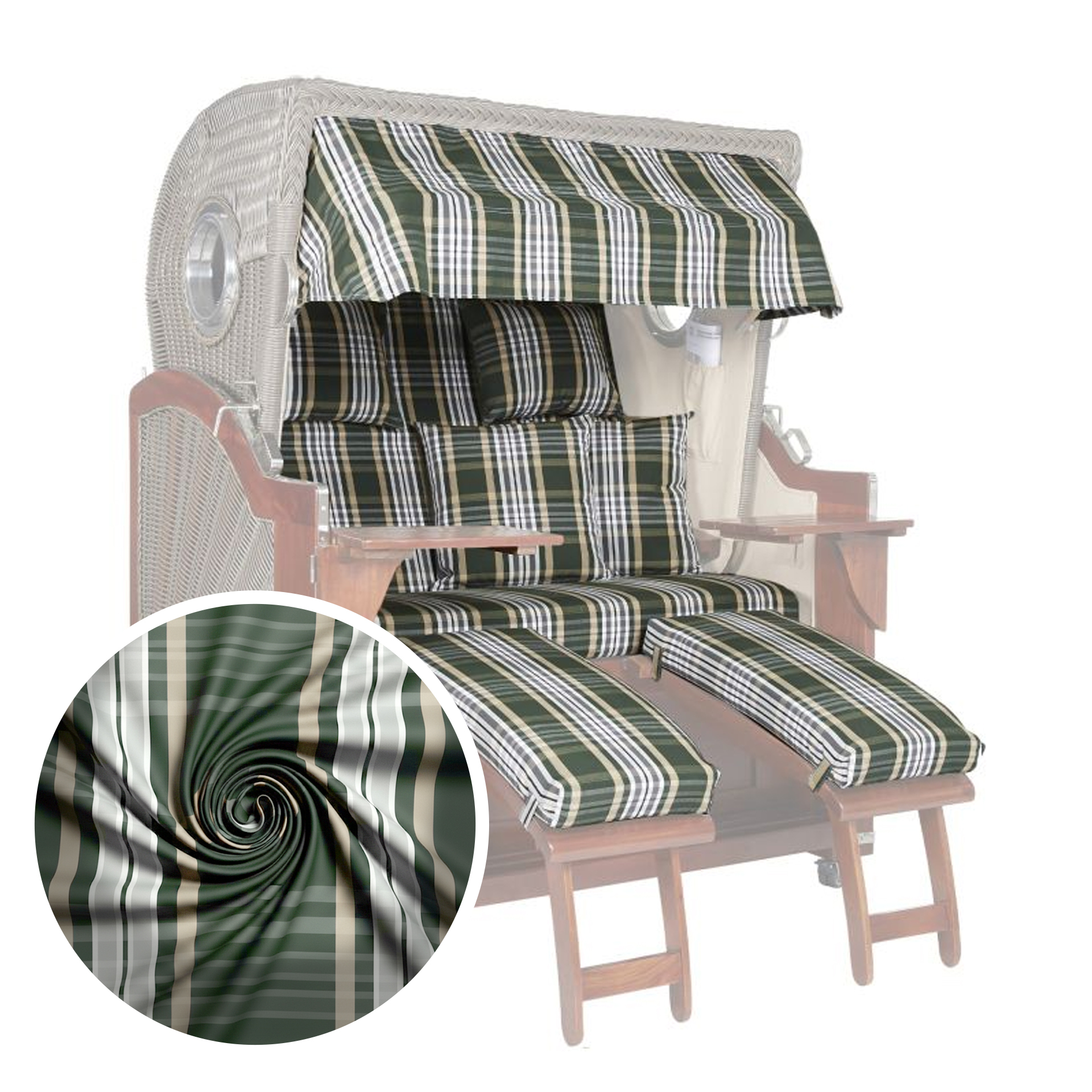 Sofort wie neu: Verblassungen, Flecken oder Abnutzung werden optisch direkt kaschiert. Die Kombination aus Grün Beige wirkt natürlich, warm und wohnlich – perfekt für Terrasse, Balkon, Poolbereich oder Ferienimmobilie. Besonders stimmig passt das Set auf unseren 2,5-Sitzer-Strandkörben Romy, Audrey und Pazifik, die damit wieder aussehen wie frisch eingerichtet – ideal zum Lesen, Zurücklehnen und Entspannen zu zweit (oder zu dritt).