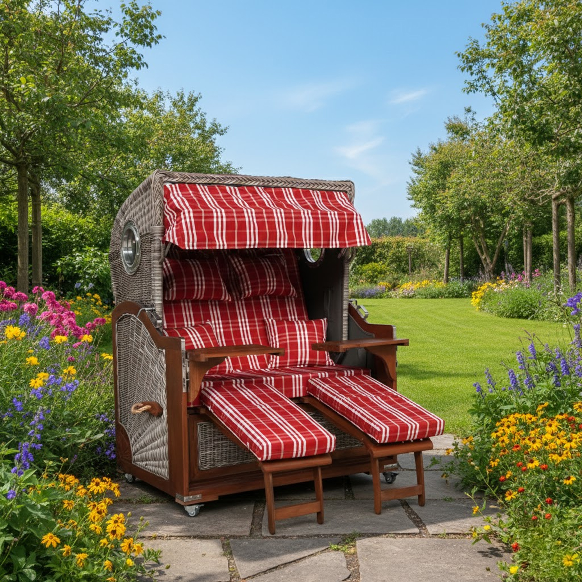 Sofort neuer Gesamteindruck: Mit dem Rot Weiß karierten Muster bekommt dein Strandkorb wieder den typischen Urlaubs-Charakter und wirkt gepflegt und einladend – ideal auf Terrasse, Balkon, am Pool oder in der Ferienimmobilie. Gleichzeitig bleibt der Sitzkomfort erhalten – perfekt für lange Lesemomente, Kaffeepause oder Sundowner. Besonders harmonisch wirkt der Bezug auf den hauseigenen Modellen Romy, Audrey und Pazifik.