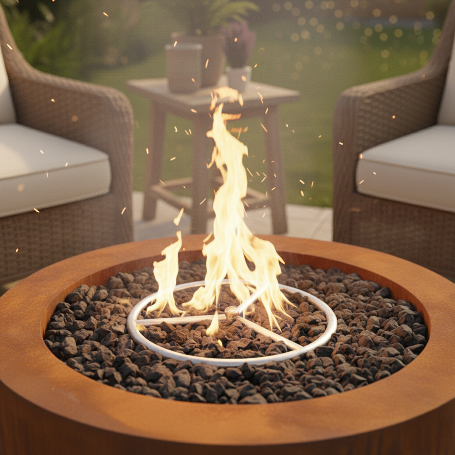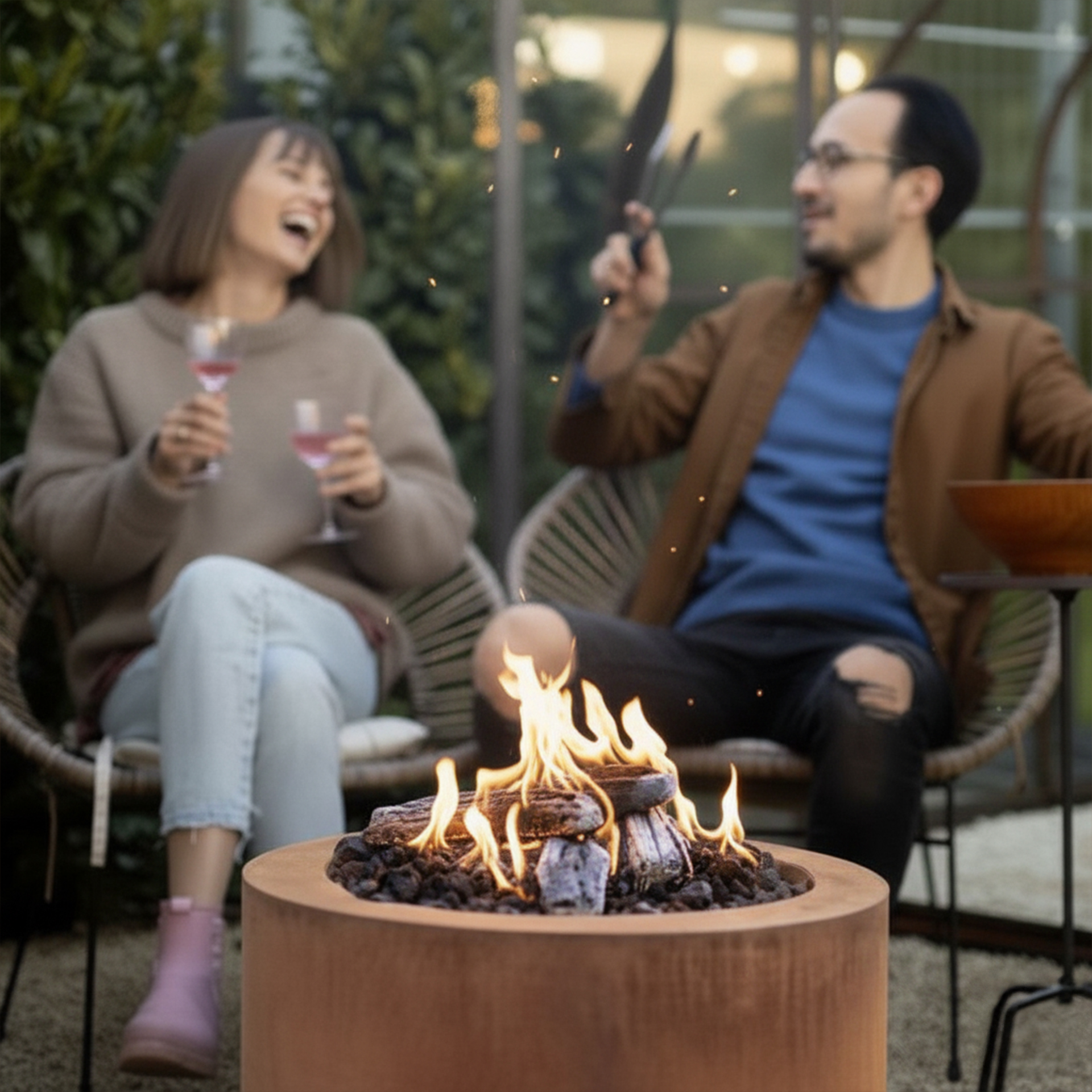 Diese runde Gas-Feuerstelle aus Cortenstahl bringt die Magie eines Lagerfeuers in Garten und auf die Terrasse – ohne Rauch. Die warme Rostpatina, das ruhige Flammenspiel und die Lavasteine für sanfte Strahlungswärme schaffen entspannte Abende unter freiem Himmel. Dank kreisrunder Form genießen alle rundum denselben Blick auf die Flammen – ideal für gesellige Runden und 360°-Gemütlichkeit.